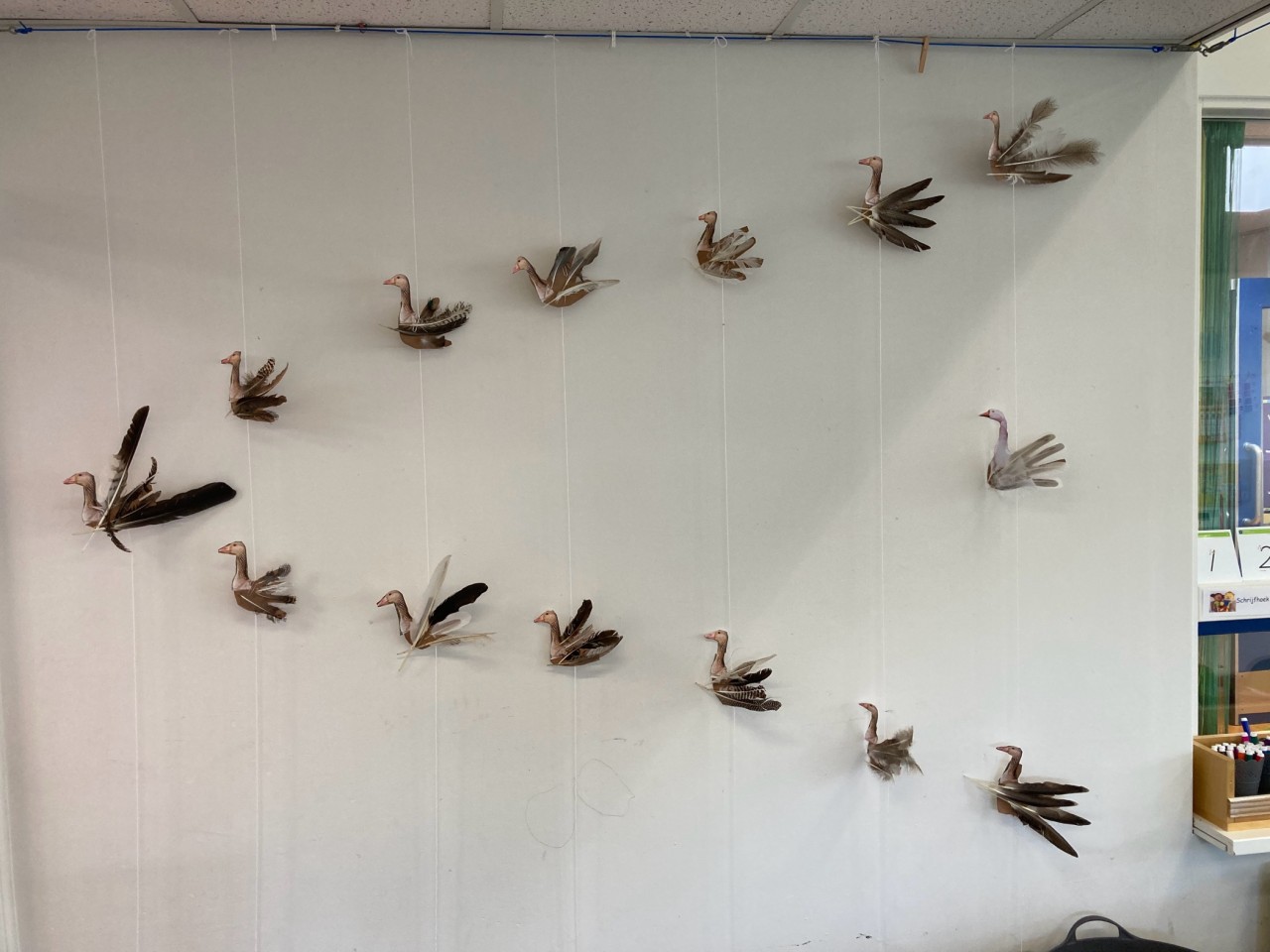 Nils Holgersson werd in het boek namelijk betoverd zodat hij zo klein als een kabouter werd en is toen op de rug van de tamme witte gans Maarten met 13 wilde grauwe ganzen meegevlogen. Toevallig hebben wij ook 13 kinderen in de klas, dus met de witte gans van de juf erbij kloppen onze knutsels precies bij het verhaal.