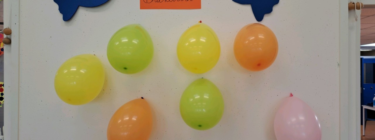 Iedere dag laten we een ballon knappen waar een opdracht in zit. (Buiten lezen, buiten werken, verstoppertje door de school etc)