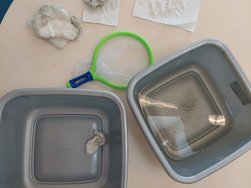 Vandaag hebben we troebel water gezeefd. Ook hebben we geleerd wat een meer is en het verschil tussen een zee en een meer en waar zout water en zoet water voorkomt.